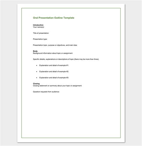 Oral Presentation Outline Template - For instance, when making an oral presentation example, make sure you have enough time to discuss all of the points in your. In this blog post, we're going to share practical presentation outline examples and 8 key elements for constructing your own outlines that will leave a lasting. In this article we'll walk through four options for creating a presentation.