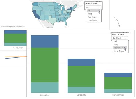 Tableau Sheet Selector . If you're changing a bar chart out for a map, then that is a good use case for a sheet selector. Using a combination of a parameter and a calculated field, you can.